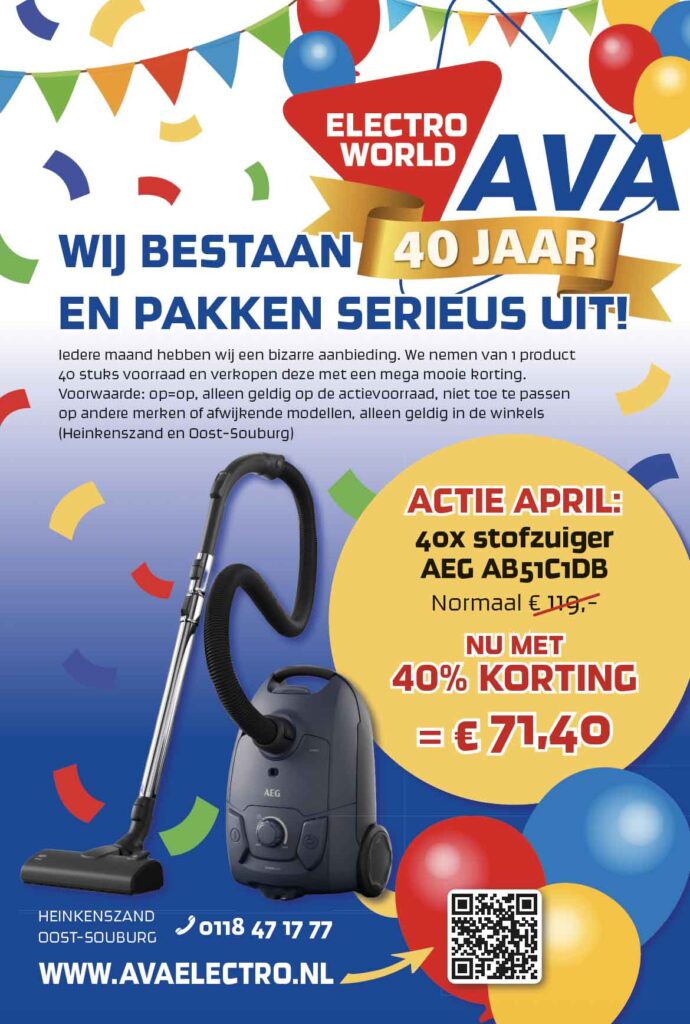 Al weer 40 jaar is AVA uw vertrouwde naam in Zeeland op het gebied van reparatieservice, of de aanschaf van huishoudelijke apparaten, inbouwapparatuur, televisies en audio. Onze winkels in Oost-Souburg en Heinkenszand staan bekend om deskundig advies, persoonlijke aandacht, een ruime keuze uit topmerken. We denken altijd met u mee voor een passende oplossing. U slaagt bijna altijd in onze winkels doordat we een breed assortiment aan apparatuur hebben.